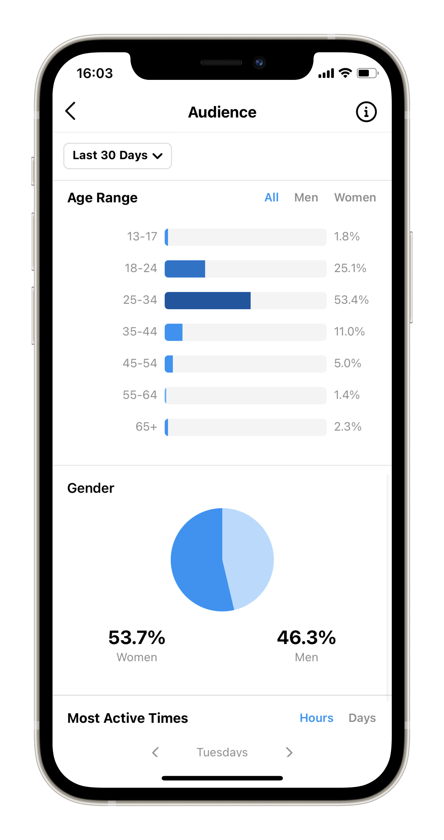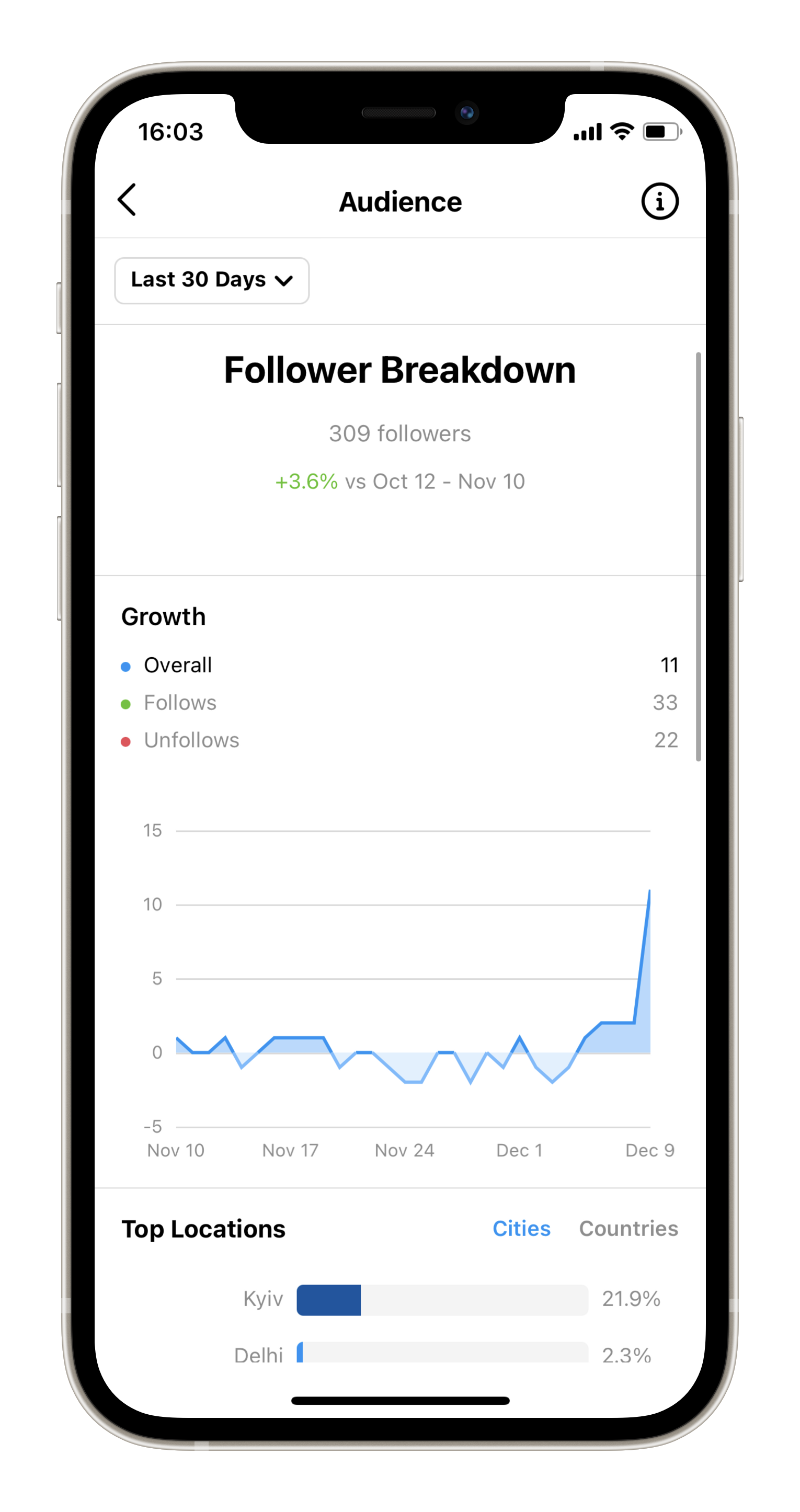 Tapping on Total Followers, you will be taken to the follower breakdown page that will help you conduct followers analysis. Here you will be able to learn more about your audience: growth (follows, unfollows), top locations (what countries/cities you followers are from), age range, gender, times when they are the most active (breakdown by hours, days).