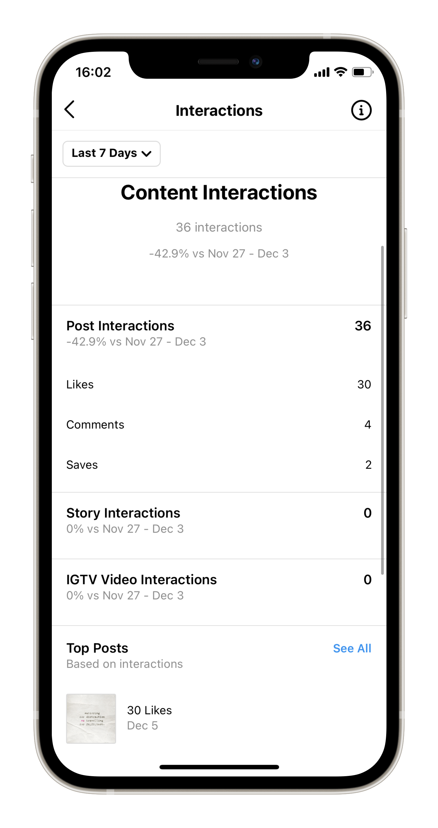 In this section you will find out the overall number of likes, comments, saves of your posts for the last week/month as well as the number of replies on your Instagram Stories.